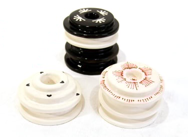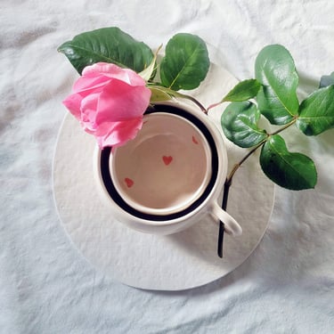 Façonnée à la main en technique du pincé, chaque pièce est unique et ornée d’un motif cœur. Sa finition rustique et ses nuances rouges, vertes et noires, évoquent un savoir faire artisanal et un plaisir intemporel.
